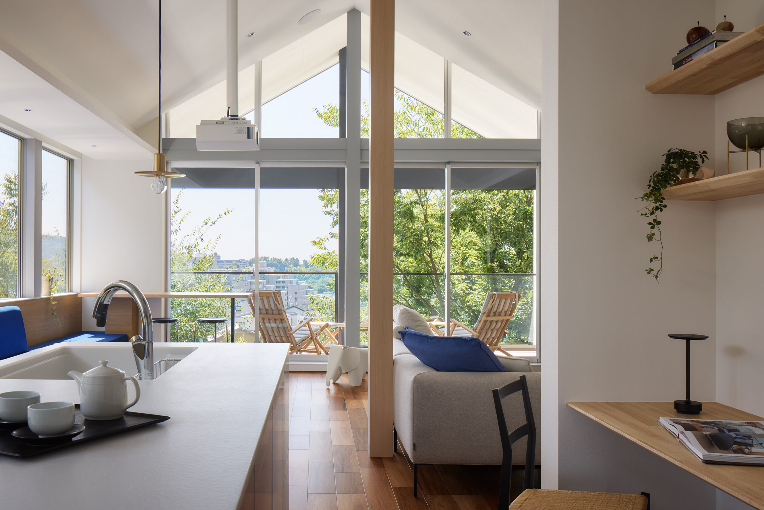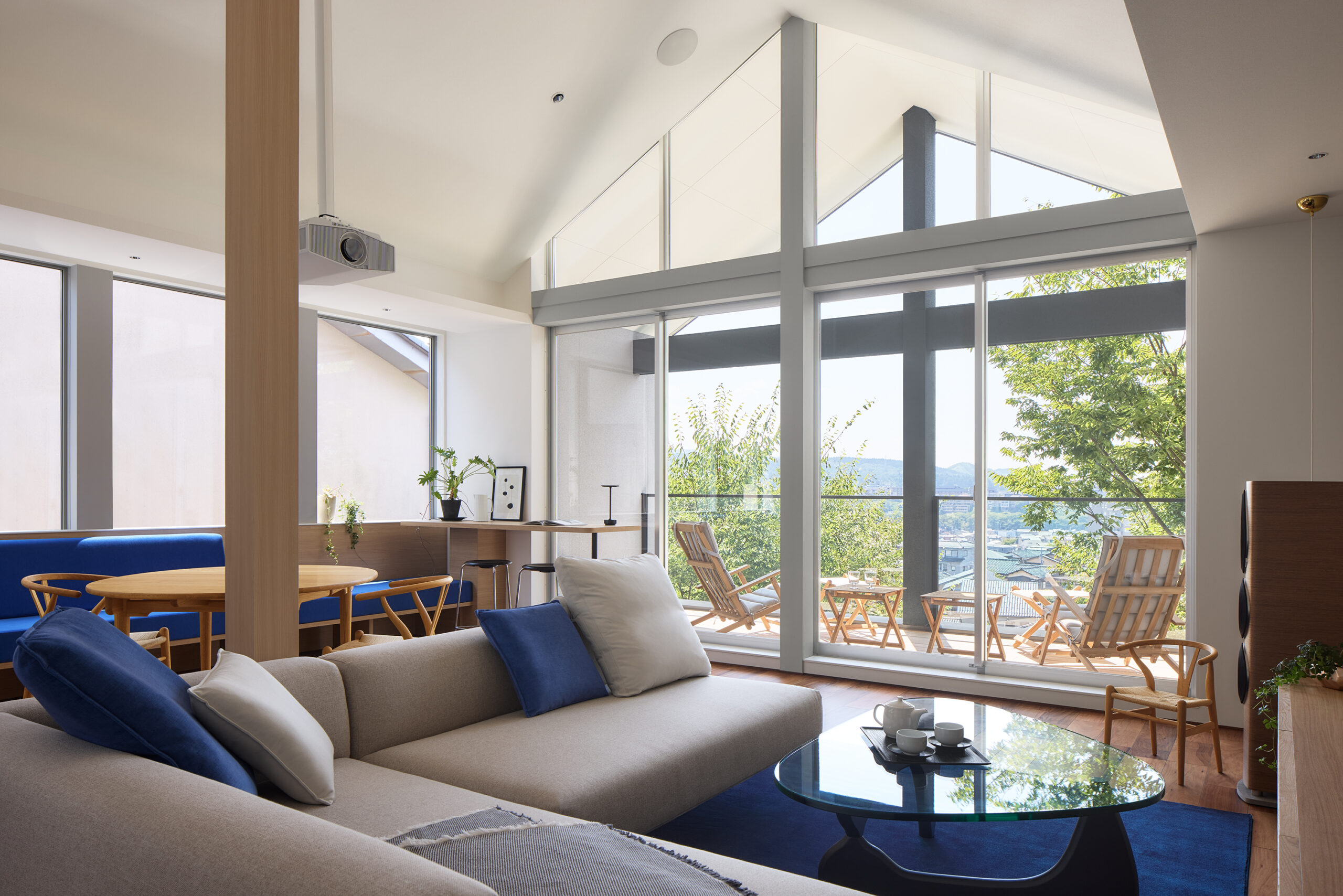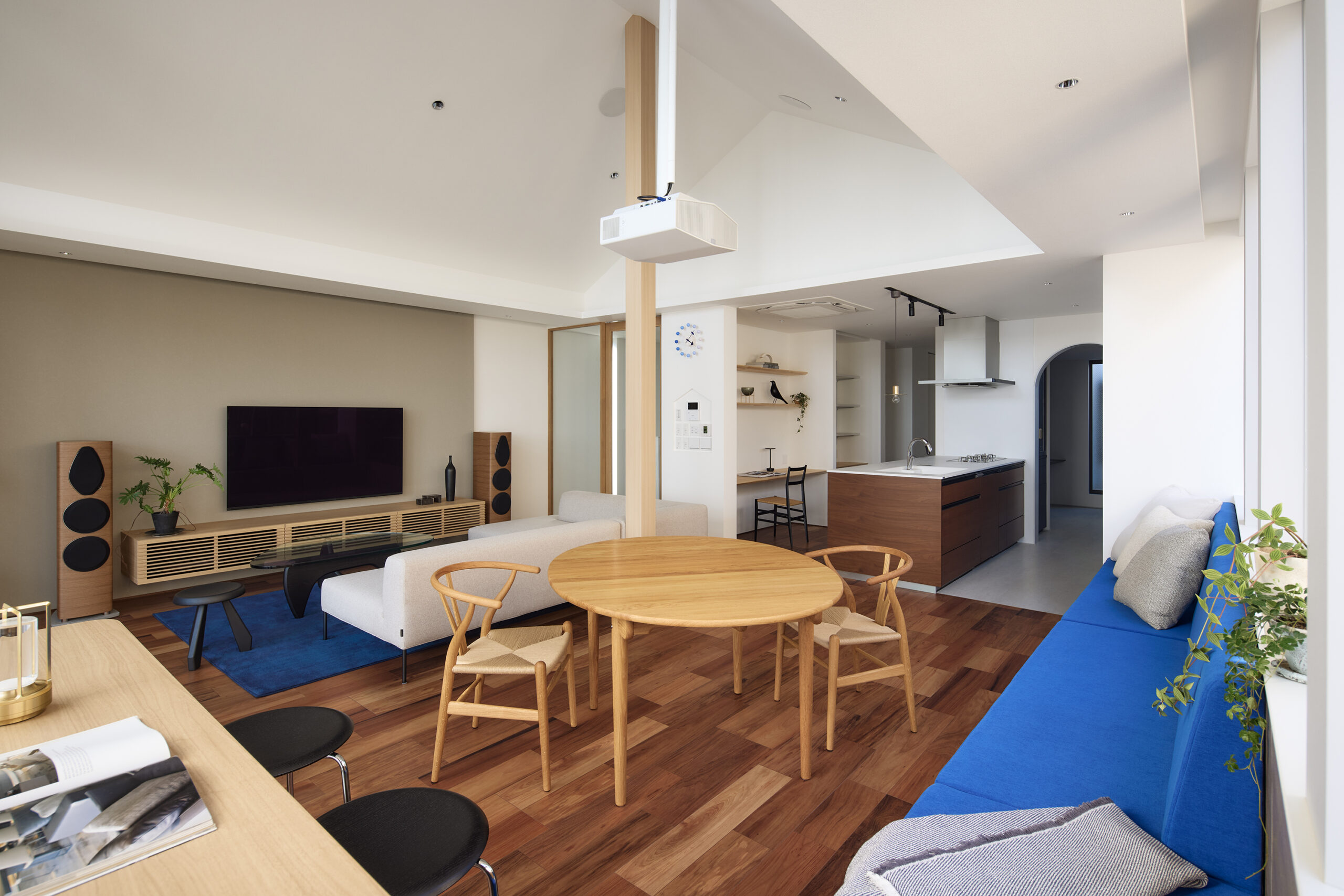 This design features a modern, open space that seamlessly merges with nature. Large glass windows and a high vaulted ceiling with clerestory windows maximize natural light and an exceptional feeling of openness. The living space and terrace are seamlessly connected, allowing residents to fully enjoy the rich greenery and views. The material and color palette prioritize natural modernity: the warmth of medium brown wood flooring and furniture is set against clean white walls. For a sophisticated accent, vibrant royal blue is used in the built-in seating and soft furnishings, creating a striking contrast with the wood and outdoor greenery. The open-plan LDK (Living-Dining-Kitchen) is functionally zoned, with wood elements subtly defining each area, including a Nordic-style dining space. A window-side counter serves as a workspace, and a projector enhances the living area, making the space adaptable to diverse modern lifestyles. Overall, the interior achieves a high level of design and comfort through a natural modern aesthetic and refined color accents.