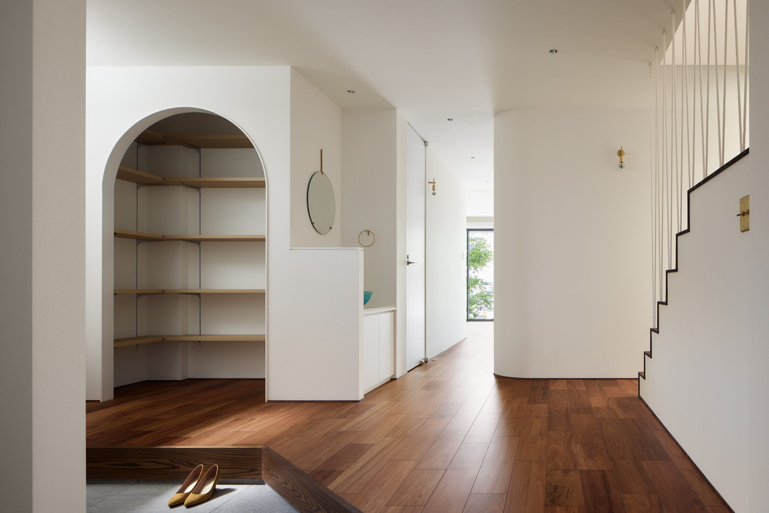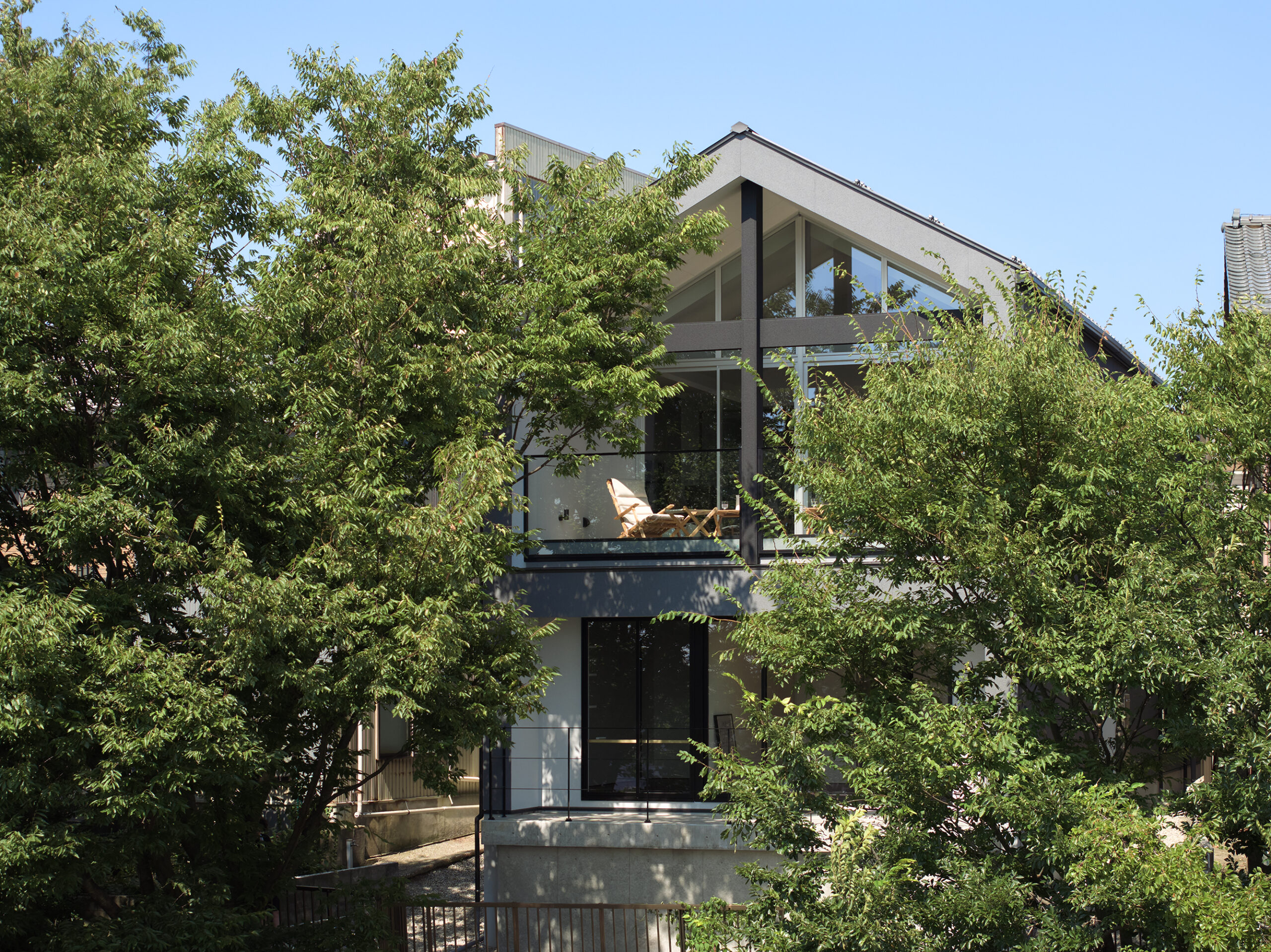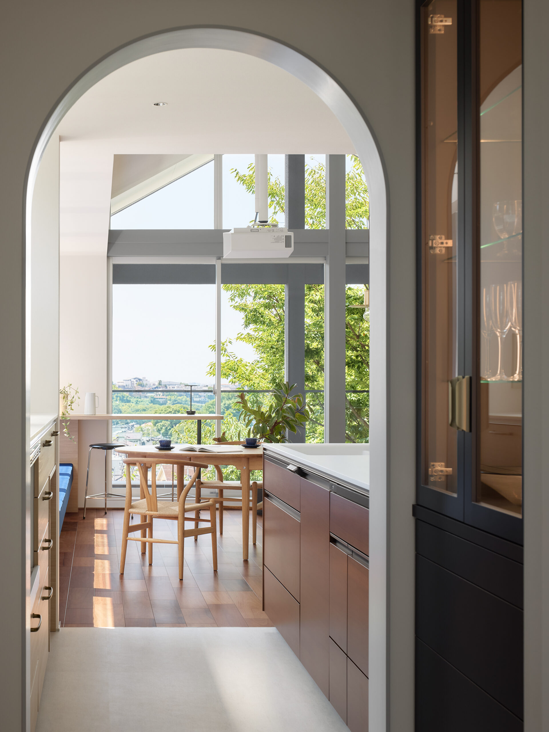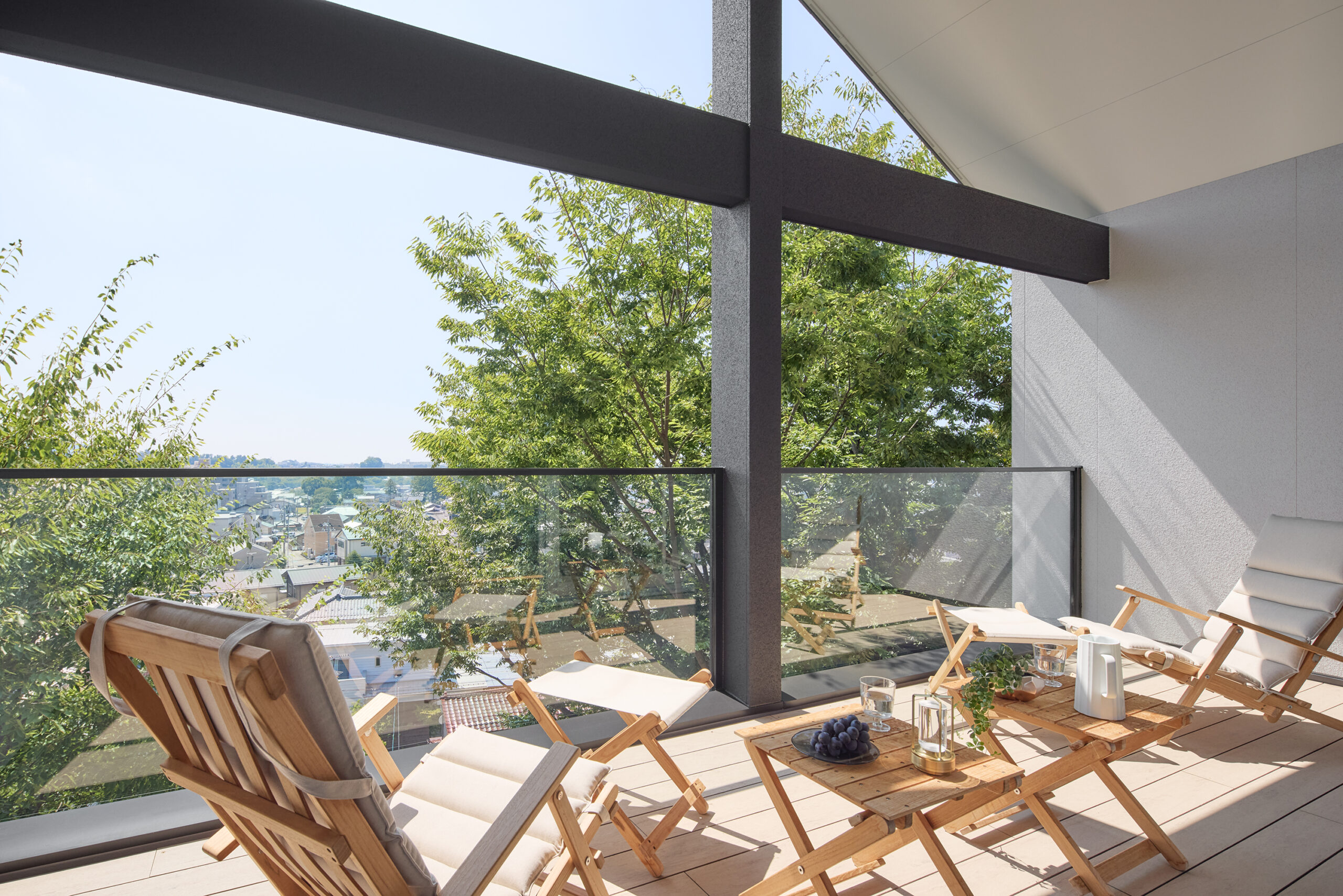 This design features a modern, open space that seamlessly merges with nature. Large glass windows and a high vaulted ceiling with clerestory windows maximize natural light and an exceptional feeling of openness. The living space and terrace are seamlessly connected, allowing residents to fully enjoy the rich greenery and views. The material and color palette prioritize natural modernity: the warmth of medium brown wood flooring and furniture is set against clean white walls. For a sophisticated accent, vibrant royal blue is used in the built-in seating and soft furnishings, creating a striking contrast with the wood and outdoor greenery. The open-plan LDK (Living-Dining-Kitchen) is functionally zoned, with wood elements subtly defining each area, including a Nordic-style dining space. A window-side counter serves as a workspace, and a projector enhances the living area, making the space adaptable to diverse modern lifestyles. Overall, the interior achieves a high level of design and comfort through a natural modern aesthetic and refined color accents.