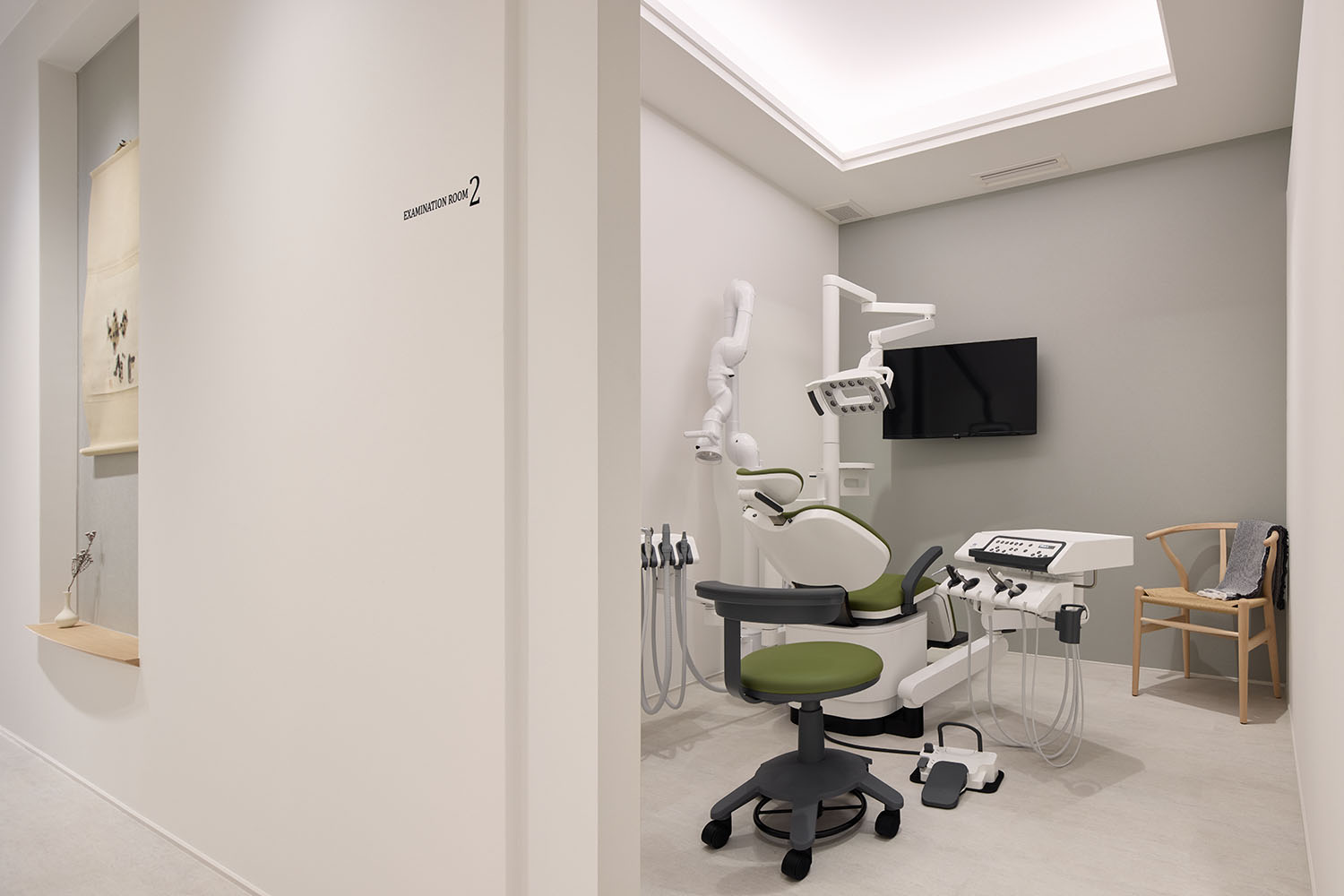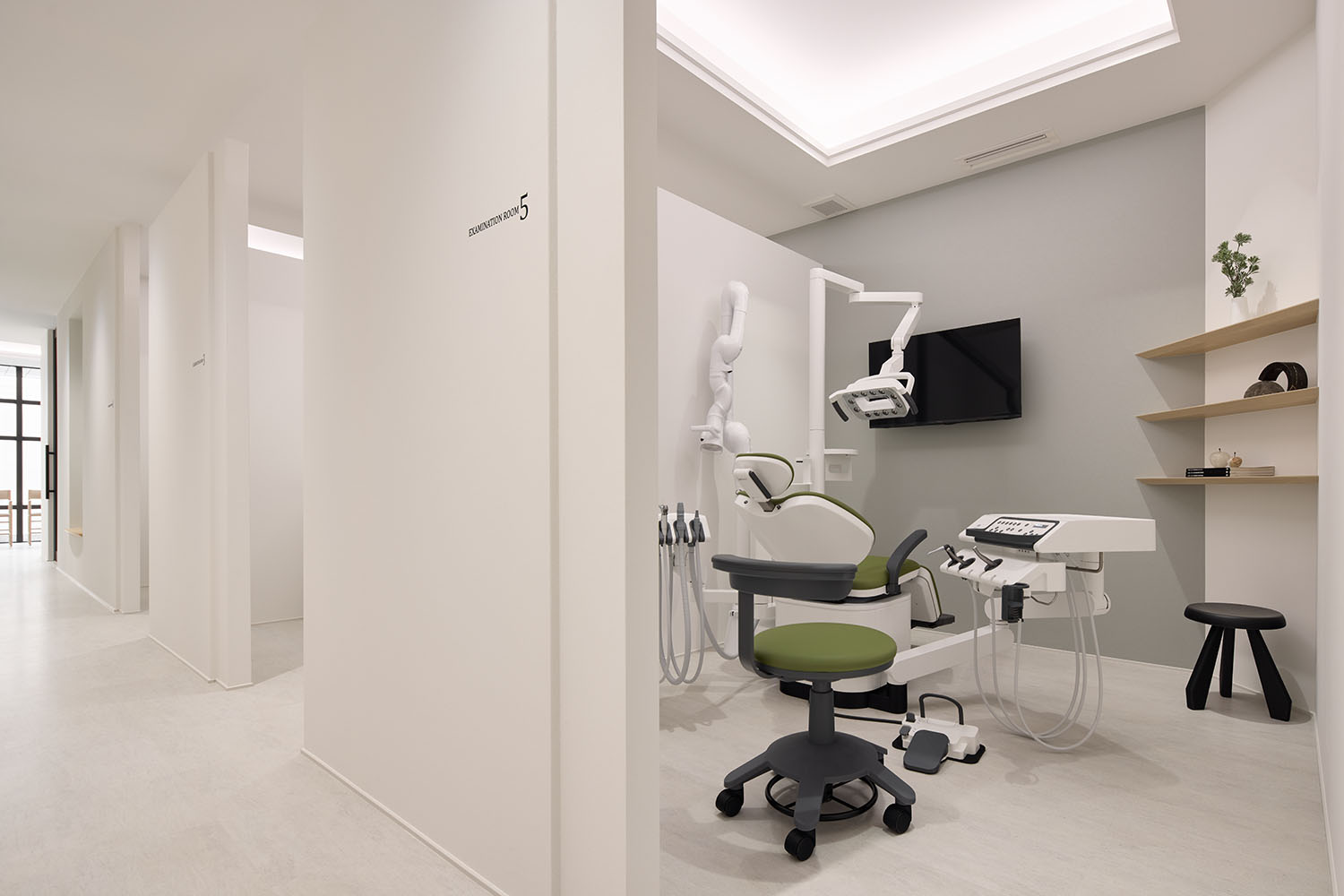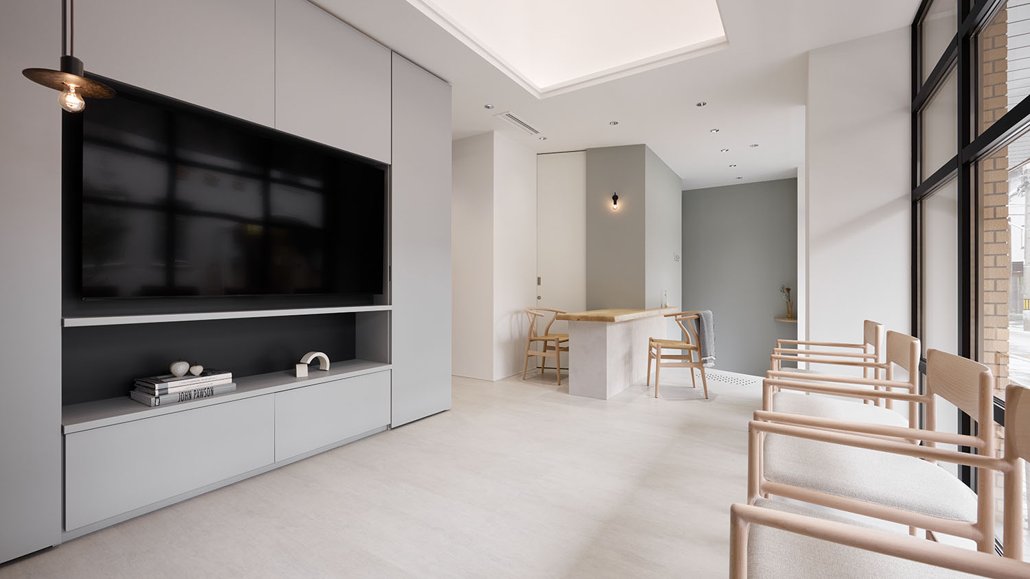 Minimalist Japanese Modern Style. The space is unified by a simple achromatic color palette based on white, neutral grey, and wood grain, emphasizing cleanliness and serenity. The chairs in the waiting area feature wooden frames and simple fabric seats, offering a gentle impression despite their linear composition. A large lattice-patterned window draws in abundant natural light, creating an open and airy atmosphere. Simple pendant and wall lights add soft shadows and accents to the space. Washi paper art displayed in the waiting area and a hanging scroll (Kakejiku) in the hallway incorporate nuances of Japanese traditional beauty and wabi-sabi. The design pursues the simple beauty of "minimalism" by eliminating unnecessary elements, while incorporating natural materials and traditional art (such as the hanging scroll) to express a calm "Japanese modern" (Wa-Modern) aesthetic. The result is a dignified space that feels sophisticated yet tranquil.