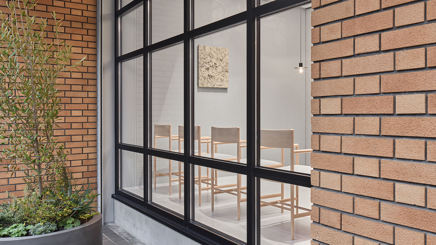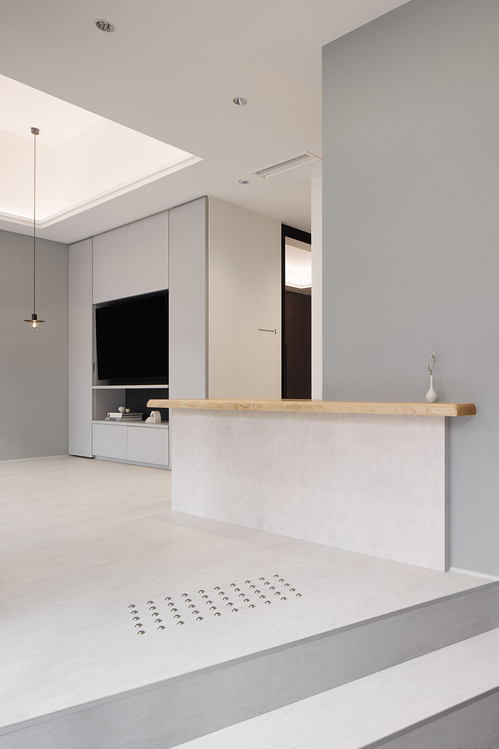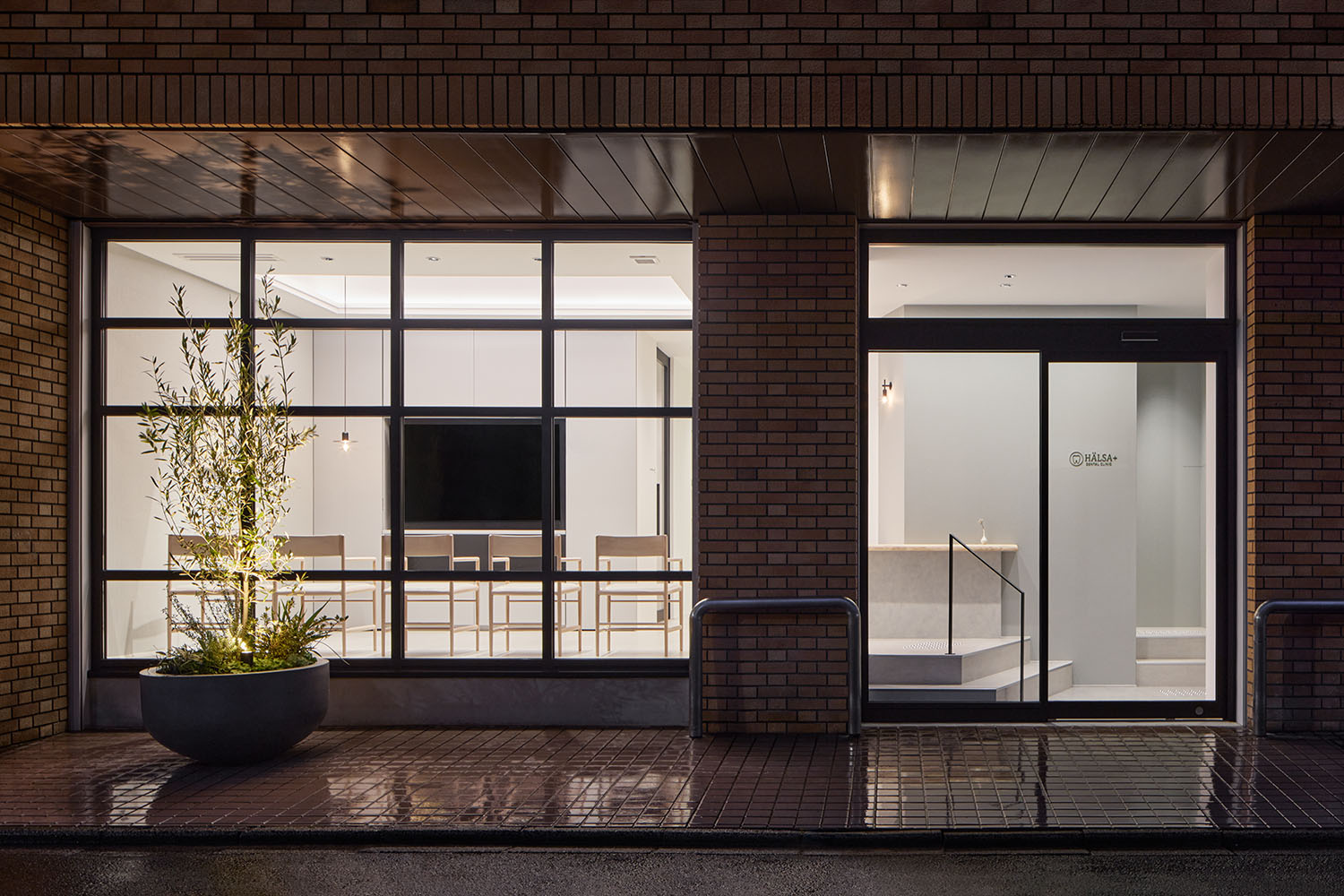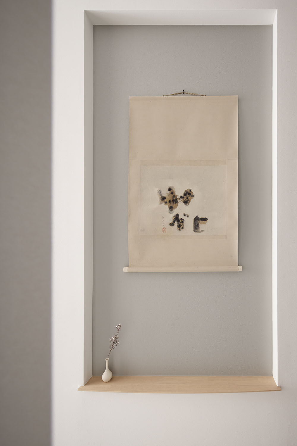 Minimalist Japanese Modern Style. The space is unified by a simple achromatic color palette based on white, neutral grey, and wood grain, emphasizing cleanliness and serenity. The chairs in the waiting area feature wooden frames and simple fabric seats, offering a gentle impression despite their linear composition. A large lattice-patterned window draws in abundant natural light, creating an open and airy atmosphere. Simple pendant and wall lights add soft shadows and accents to the space. Washi paper art displayed in the waiting area and a hanging scroll (Kakejiku) in the hallway incorporate nuances of Japanese traditional beauty and wabi-sabi. The design pursues the simple beauty of "minimalism" by eliminating unnecessary elements, while incorporating natural materials and traditional art (such as the hanging scroll) to express a calm "Japanese modern" (Wa-Modern) aesthetic. The result is a dignified space that feels sophisticated yet tranquil.